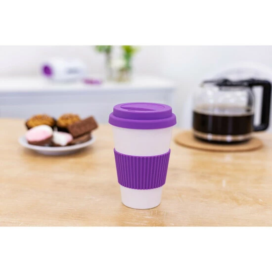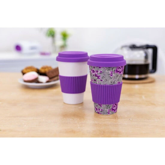 Craft in style with this travel cups thatare ideal for home or on the go. There are two designs: a white cup with purple lid and sleeve and a floral cup with purple lid and sleeve.
