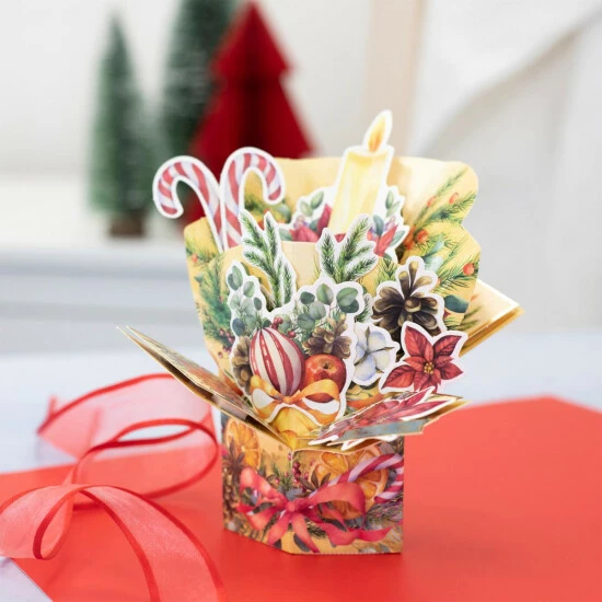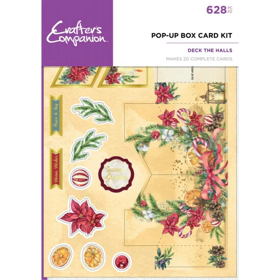 - 628-piece Pop-Up Box Card Kit – Deck The Halls, includes: 40 printed, die-cut sheets and 20 plain, white envelopes