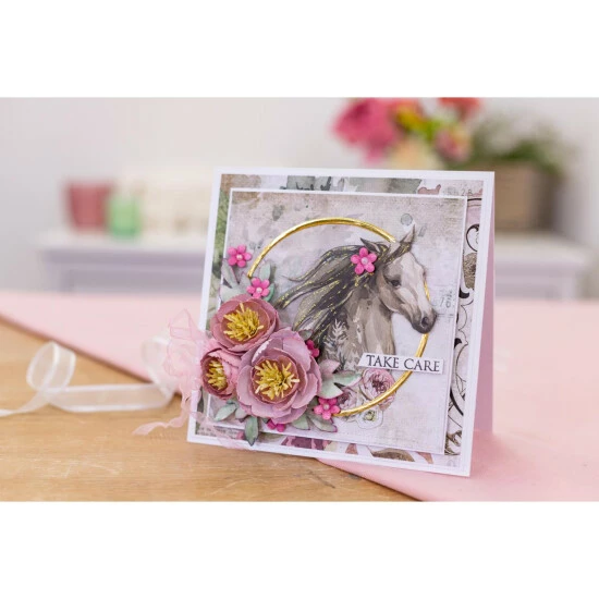 Peonies, ponies, lumieres and lanterns combine with a delicate and dreamy antique white, dappled grey and “faded grandeur” color palette for this Belle Manor kitTo appreciate the collection in all its glory, take a peek at the stunning patterned papers. Peony dies and flower forming foam have been included to add fabulous 3D florals to your card and gift designs.