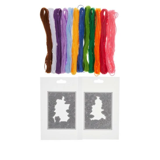 - 12 Embroidery threads; each approx. 26.2 feet long; colors include Blue, Brown, Dusty Pink, Green, Lavender, Light Blue, Light Green, Orange, Pink, Purple, White and Yellow