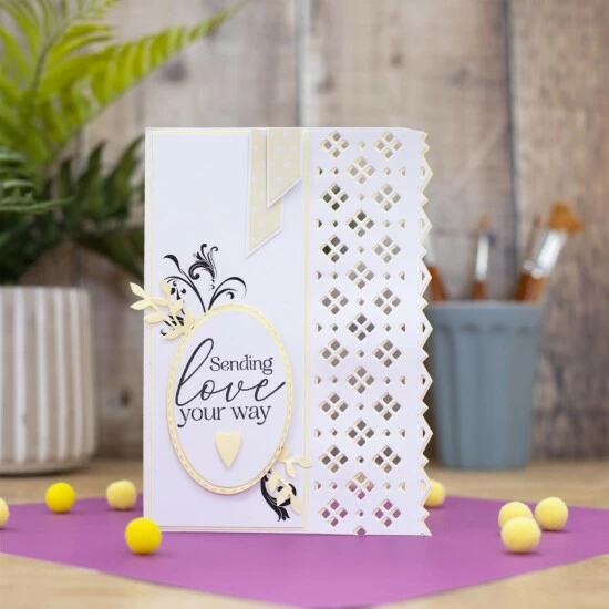Use this set to create elegantcards for all occasions. These beautifuldies are so versatile. Use them to cut through two layers of card stock, simultaneously, resulting in a perfectly aligned, intricate die-cut edge that incorporates both the front and the back of the card base. Use them vertically or horizontally. Think of the possibilities.