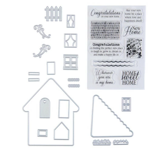 Welcome to Happy Home. Thisdie set includes all of the dies you need to create the shaped card base plus additional dies to bring your shaped card to life. Thematching stamp set features an abundance of sentiments and accents with which to complete your designs. Use them to create toppers for cards, wall art, handmade gifts and much more.