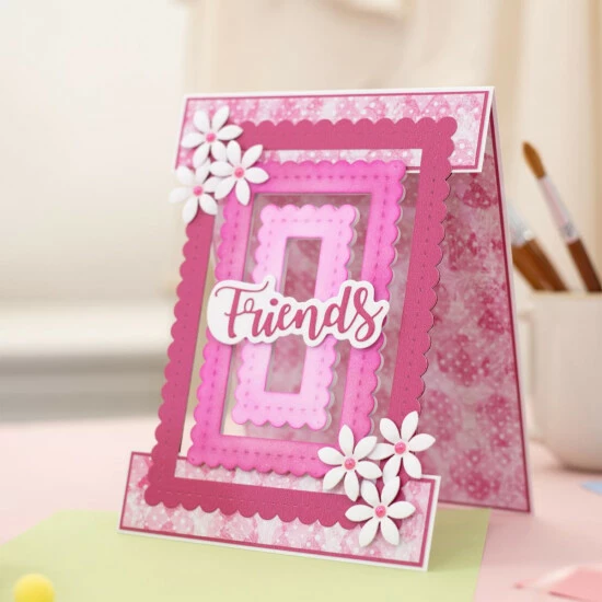 Use the rectangular and square frames on card bases to highlight stamped/die-cut sentiments and embellishments, photos, artwork, decoupage and much more.
