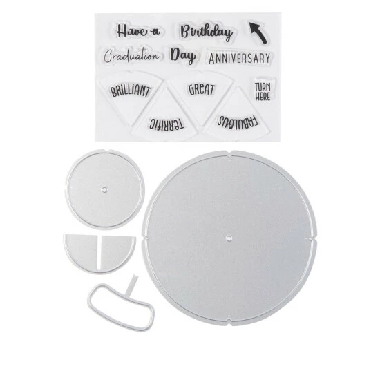 Inject some fun into your cards with this set. Simply rotate the wheel to reveal four sentiments for you to mix and match with the additional stamps included in this set.