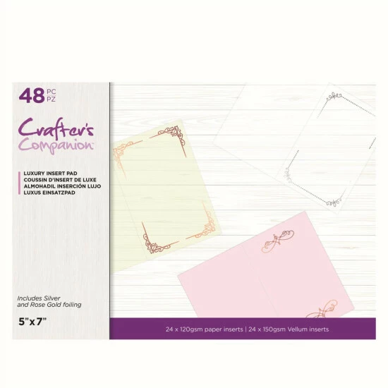 Customize your cards with this set of Luxury Insert pads from Crafter’s Companion. Both pads feature paper and vellum inserts embellished with silver and rose gold foiling. Perfect for stationary lovers and all levels of crafting ability, this set pairs perfectly with the Crafter’s Companion Sentiment Verse Stamp & Card bundle (sold separately).